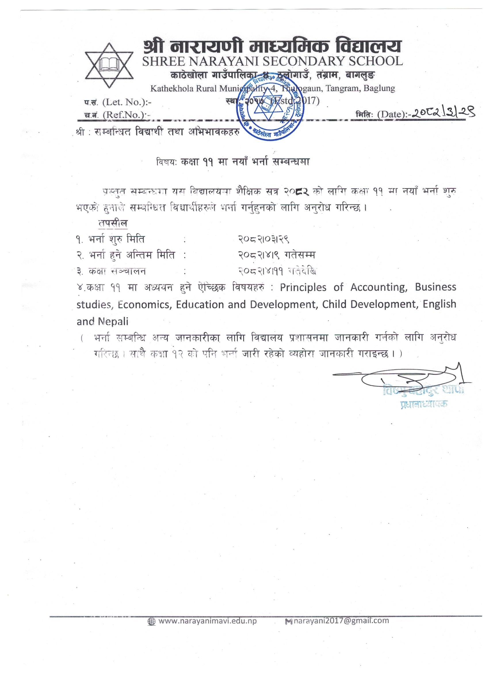 शैक्षिक सत्र २०८२ मा कक्षा ११ मा भर्ना सम्बन्धमा